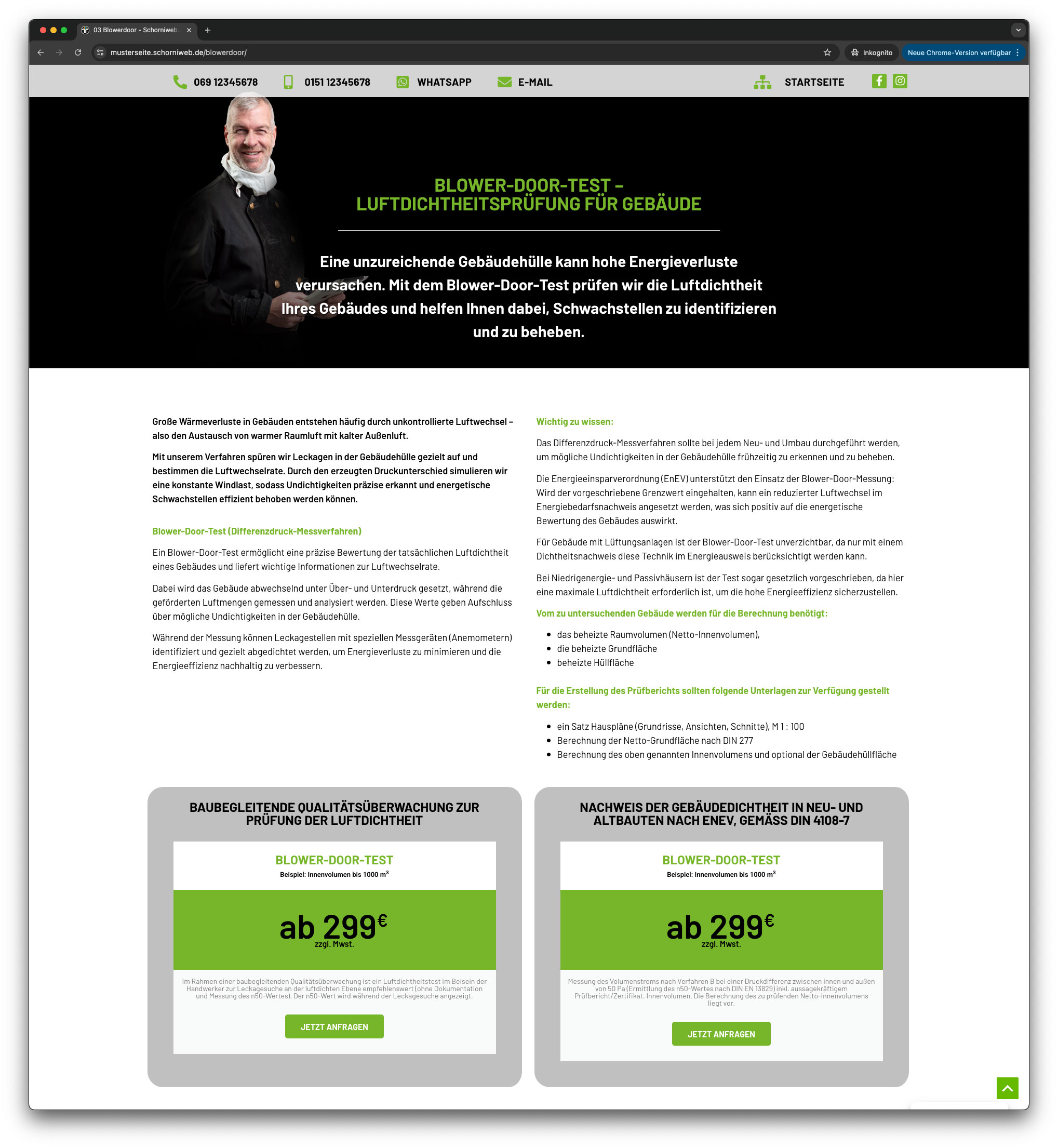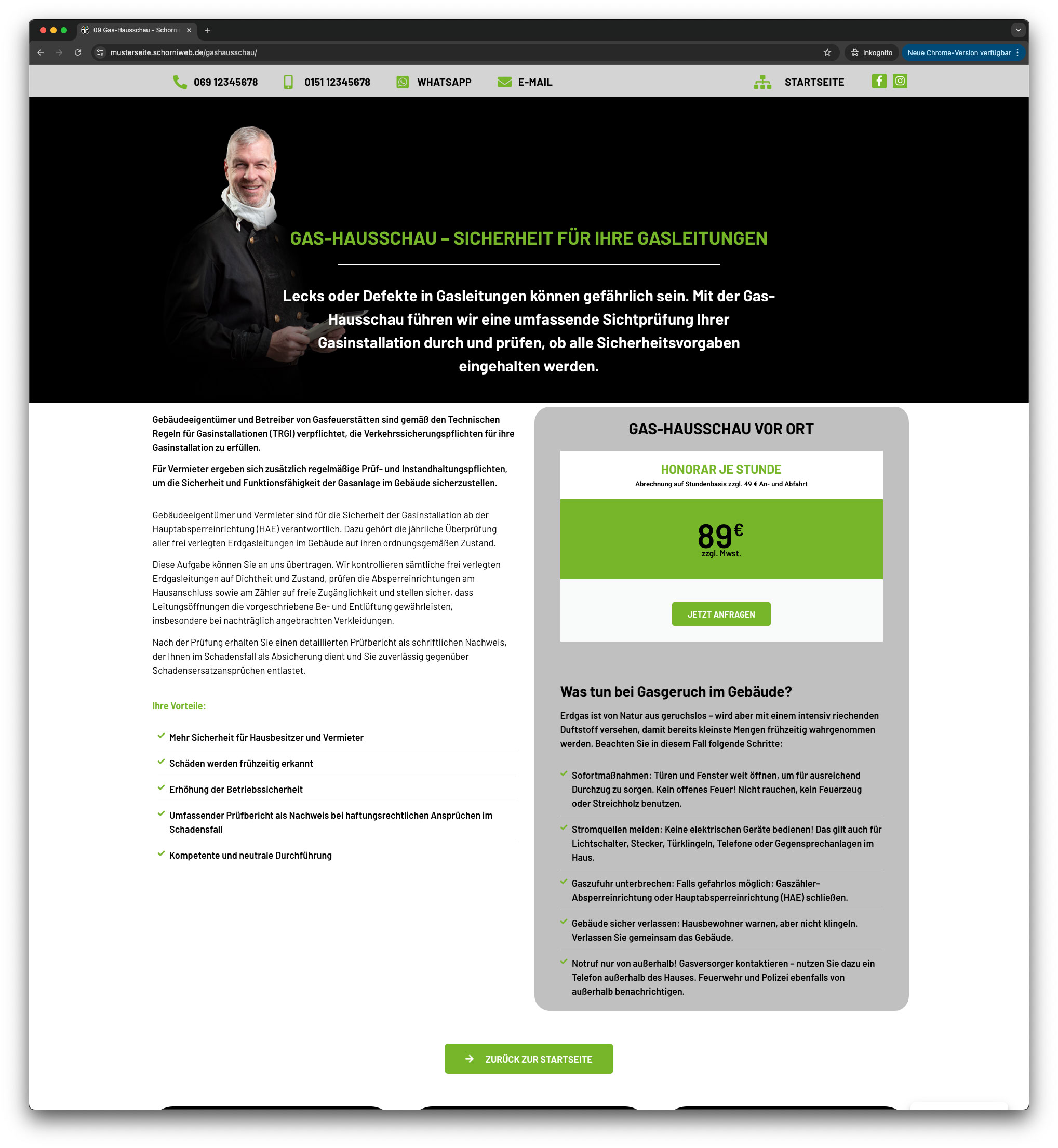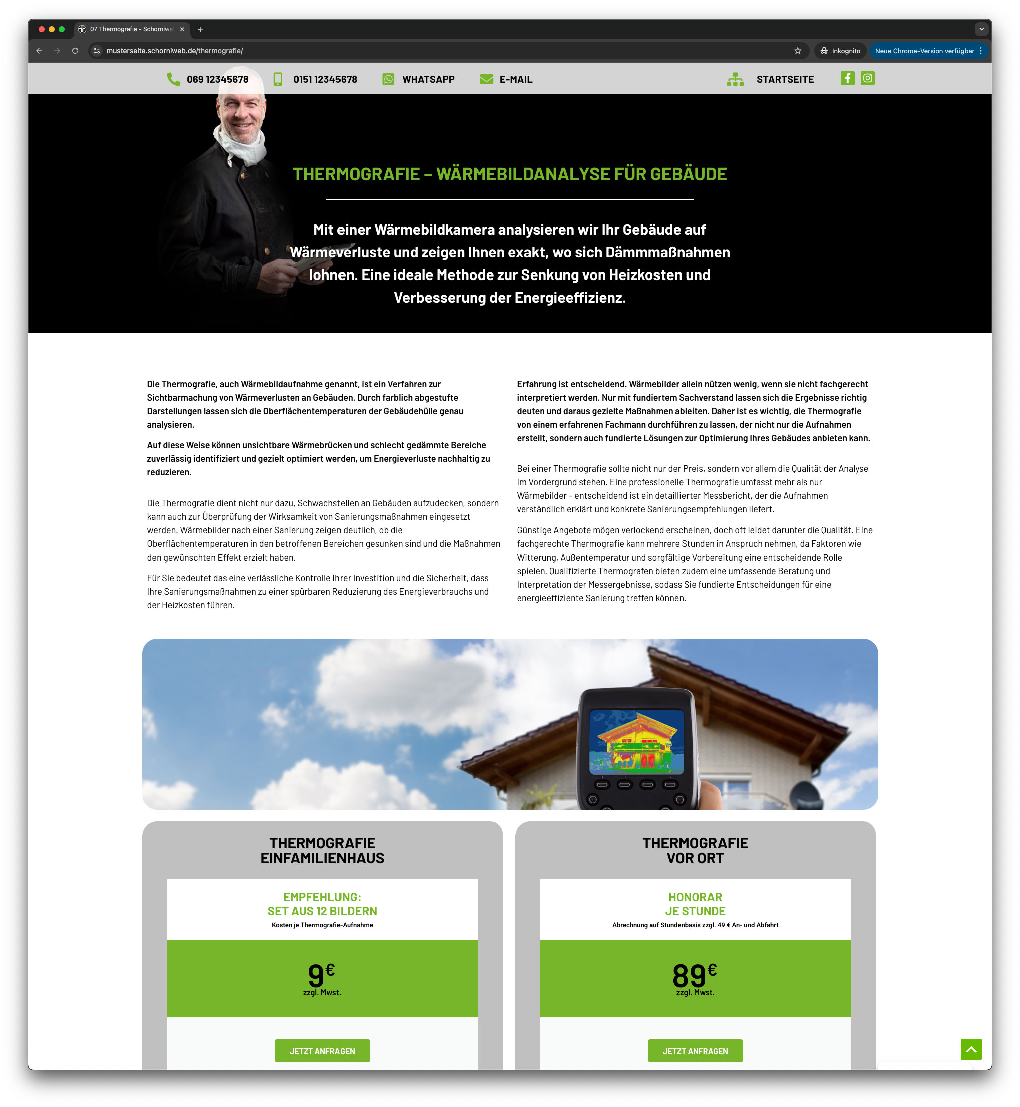 SCHORNIWEB bereitet Ihre Leistungen präzise und verständlich auf – auf Wunsch auch mit transparenten Preisen. So erkennen Kunden den Nutzen sofort, Anfragen werden gezielt gefiltert, und die kostenlose Beratung am Telefon oder im Keller entfällt.